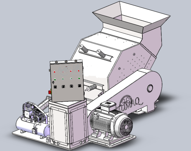 在工作流程上鋁型材通過上料輸送裝置被送入設(shè)備強制喂料和破碎口,通過壓輥和粗碎軸的破碎加工將鋁型材進(jìn)行初級破碎,經(jīng)過初級破碎后的鋁型材進(jìn)入設(shè)備主機腔,在高速大扭矩電機的驅(qū)動下,主機轉(zhuǎn)子上的錘頭輪流擊打進(jìn)入主機腔內(nèi)的鋁型材通過襯板與錘頭之間的空間,待破碎壓塊在破碎腔內(nèi)可得到充分而有效的細(xì)碎,將待破碎物壓塊撕裂成合乎規(guī)格的破碎物后,從篩網(wǎng)中流下來。破碎物料經(jīng)過空氣回旋分揀系統(tǒng),把鋁型材中的各種物料進(jìn)行分離,在設(shè)備底部卸出的物料再通過輸送設(shè)備運送到集料點,在此過程中物料中含有的非磁性物料在磁選機的作用下被分選卸出生產(chǎn)線落至非磁性物料料堆。另外整個系統(tǒng)裝有除塵裝置,將生產(chǎn)過程中產(chǎn)生的粉塵污染危害降至低。該設(shè)備主要有產(chǎn)量高、能耗低、效率高、出料細(xì)碎均勻等優(yōu)點。并且在使用該設(shè)備時,噪聲低、無污染,操作簡單、維護方便。